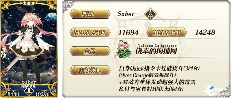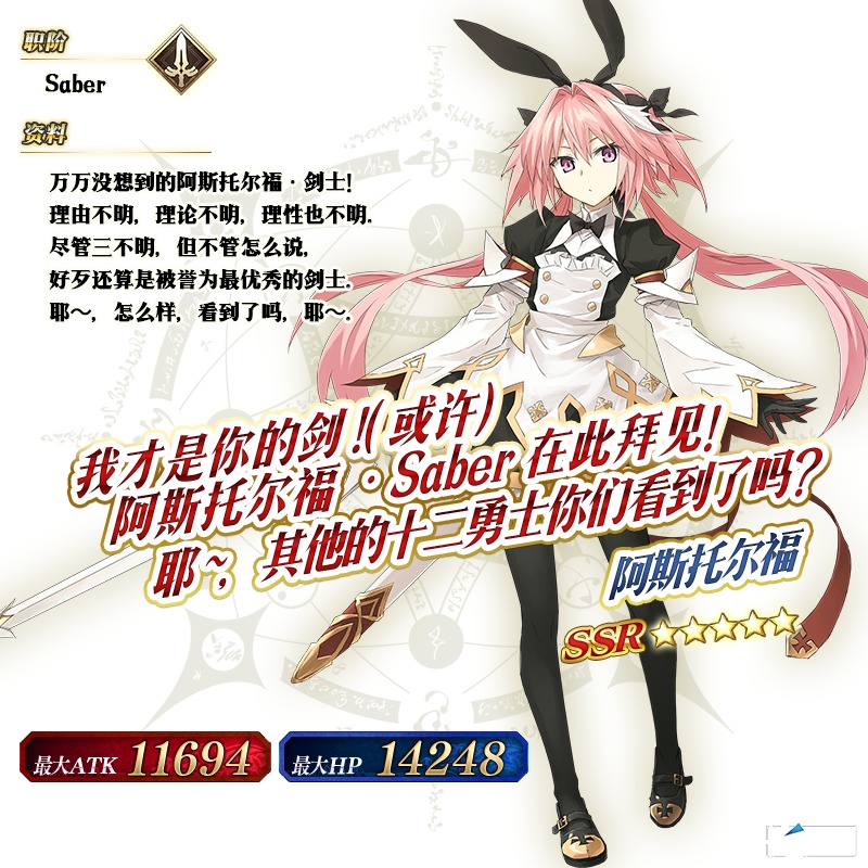 ※以上的「★5(SSR)阿斯托尔福(Saber)」的立绘为灵基再临第3阶段。