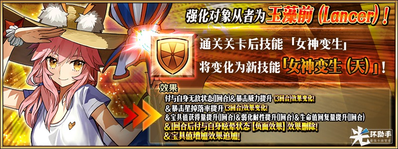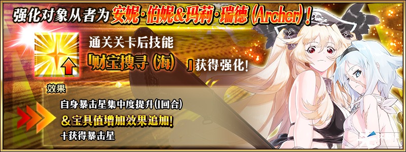 强化「★5(SSR)玉藻前(Lancer)」「★4(SR)安妮·伯妮&玛莉·瑞德(Archer)」「★4(SR)海伦娜·布拉瓦茨基(Archer)」的特别关卡「从者强化任务」将在迦勒底之门中作为常驻关卡追加。