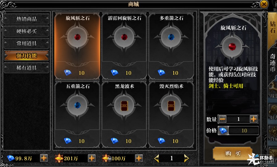 三个职业的很多技能在【商城-强力技能】处购买,且前期技能非常便宜,跟随主线任务完成即可获得。转职后的技能需要花费一定的钻石获得。