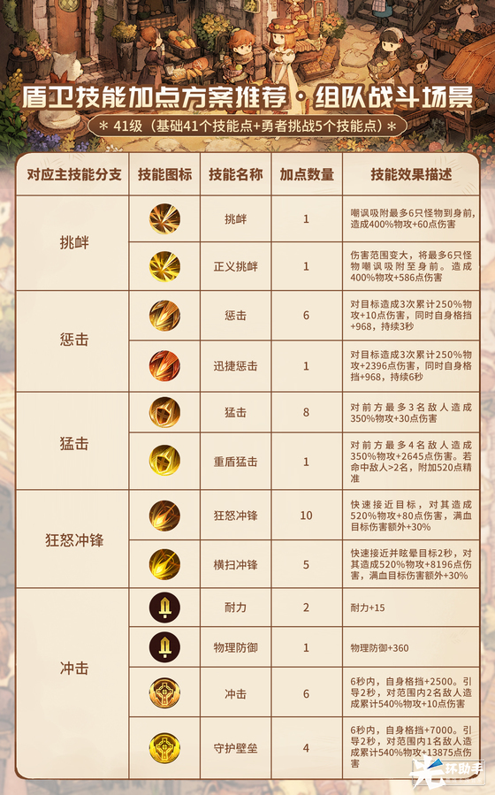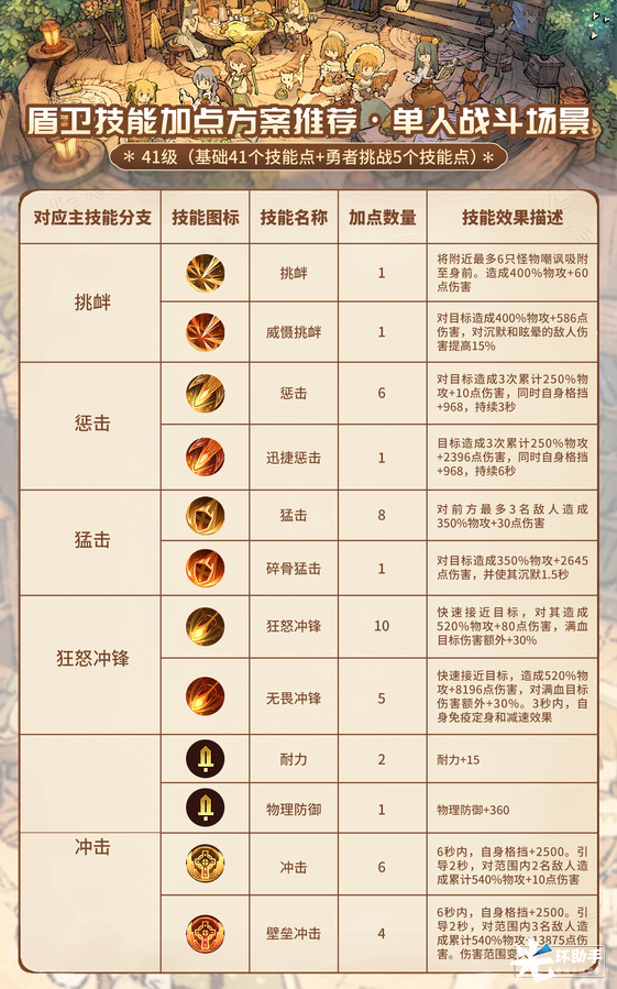 盾卫有5个主要技能,基于技能特点可以分为2种基础的技能方向,强化输出方向和强化防御方向,为了让勇者们更轻松上手,特准备了两套参考的技能加点方案,供勇者们参考学习!