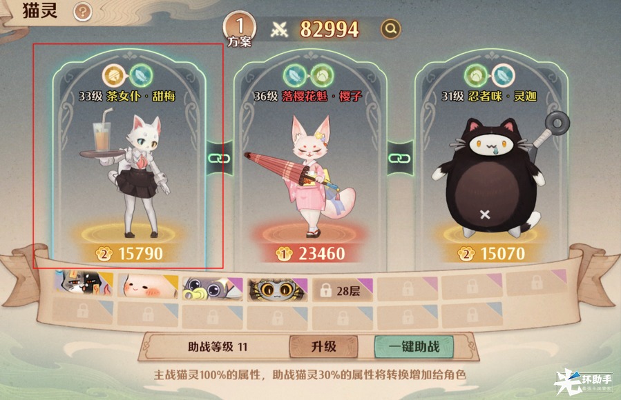 3)上阵的三只猫灵中,第一只无法触发技能的连锁效果,建议将战力高/且能触发连锁技能效果的猫灵放置在第二、第三号位;