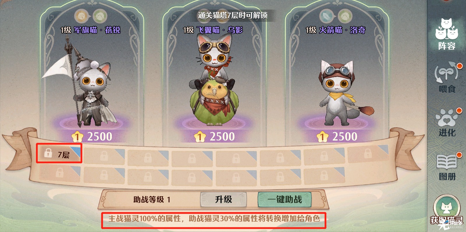 4)多打阿奇古塔开助战位,升级主战位可以上阵更多、更高品阶的猫灵,提升角色属性(助战猫灵30%的属性将转换增加给角色)。