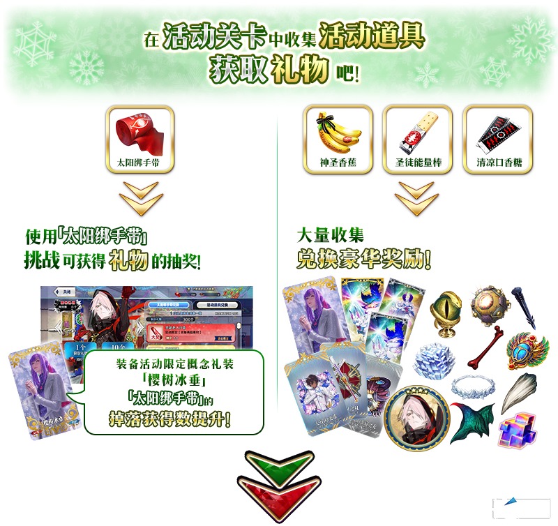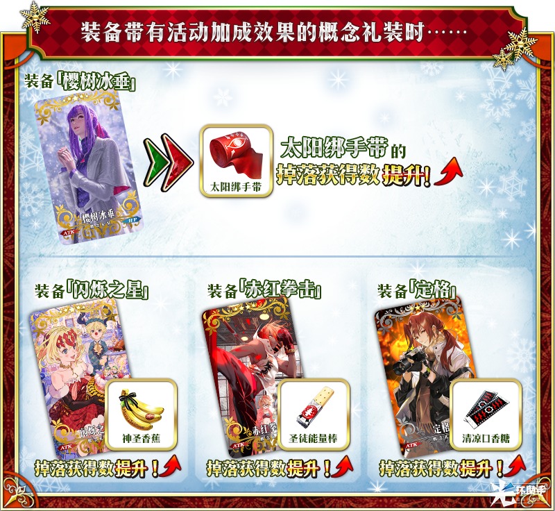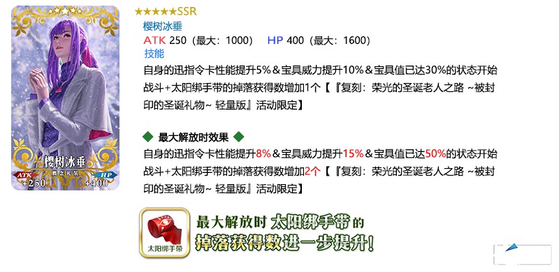 装备通过活动道具交换获得的活动限定概念礼装「★5(SSR)樱树冰垂」,可以提升活动道具「太阳绑手带」的掉落获得数。
