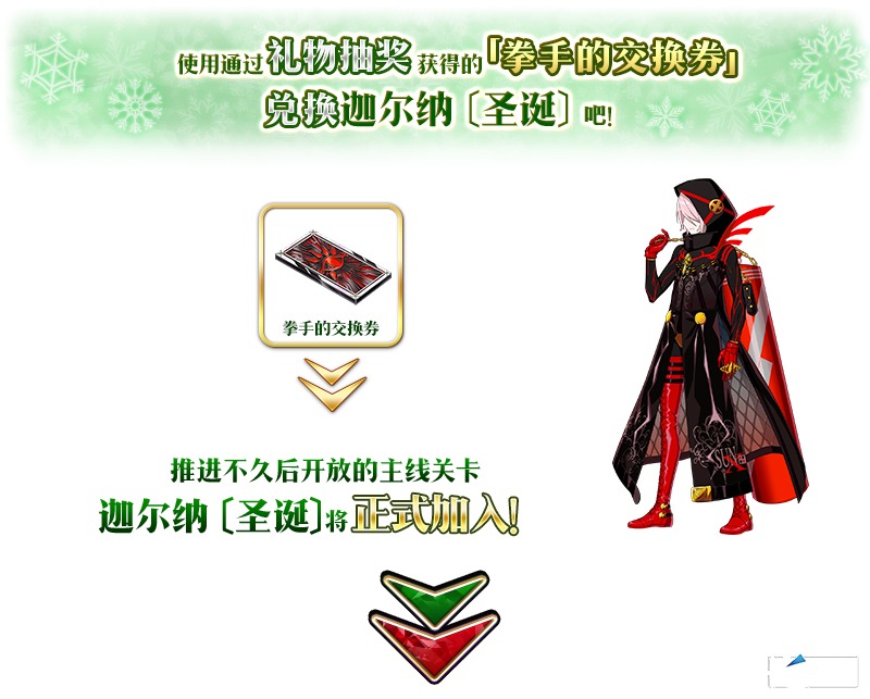 ※通关本活动的尾声后,可以使用拳手的交换券在活动道具交换中兑换「★4(SR)迦尔纳〔圣诞〕」