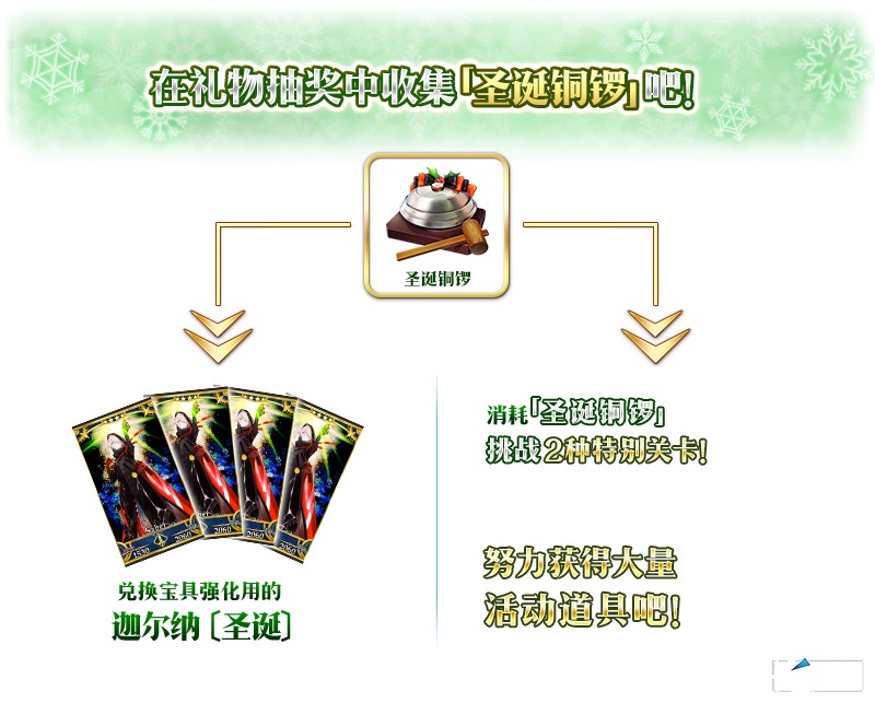 ※礼物池中的活动道具「圣诞铜锣」不仅可用于兑换「迦尔纳〔圣诞〕【宝具强化用】」和素材,还可用于挑战特别关卡。