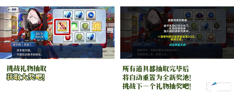 ※本次活动为复刻轻量版,因此礼物奖池有更新上限。上限为19次,20次及以后将不会更新,敬请注意。