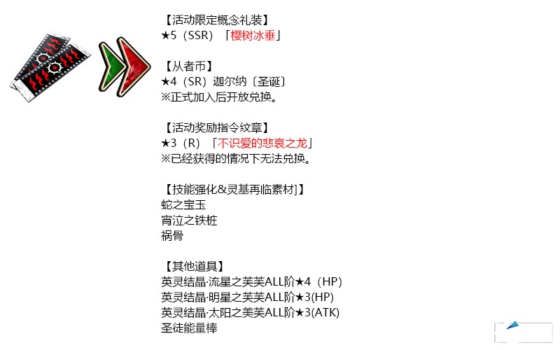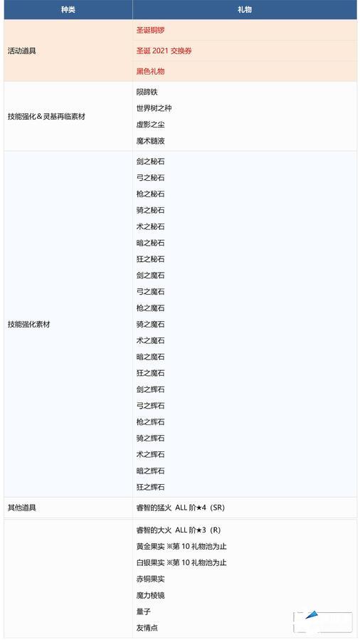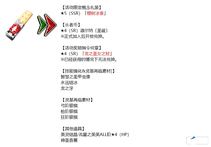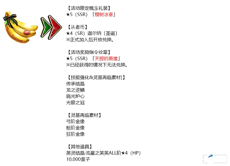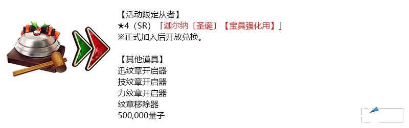 ※「圣诞铜锣」和「迦尔纳〔圣诞〕【宝具强化用】」的兑换,将在「★4(SR)迦尔纳〔圣诞〕」正式加入后开放。