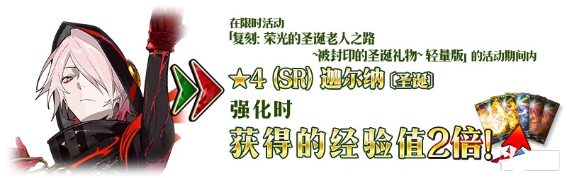 本次活动的期间内,「★4(SR)迦尔纳〔圣诞〕」强化时所获得的经验值提升为2倍。