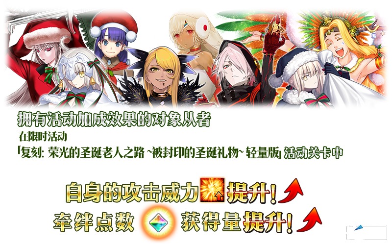 在复刻前的限时活动「荣光的圣诞老人之路 ~被封印的圣诞礼物~」中已经获得「★4(SR)迦尔纳〔圣诞〕」的情况下,本次活动中能获得特典。