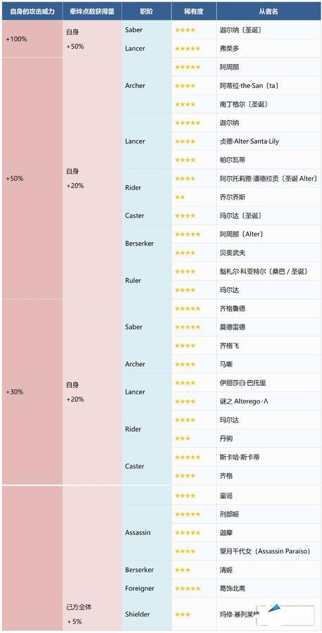 活动期间内,下表中的从者将在活动关卡中被付与「自身的攻击威力提升」和「牵绊点数获得量提升」的加成效果。