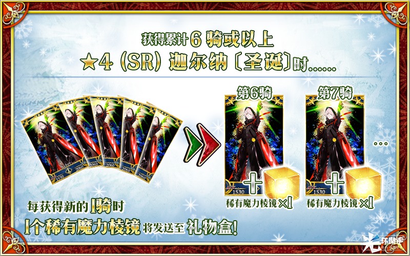 获得「累计6骑及以上」「★4(SR)迦尔纳〔圣诞〕」的情况下,从第6骑开始,每获得新的1骑时,1个稀有魔力棱镜将发送至礼物盒。