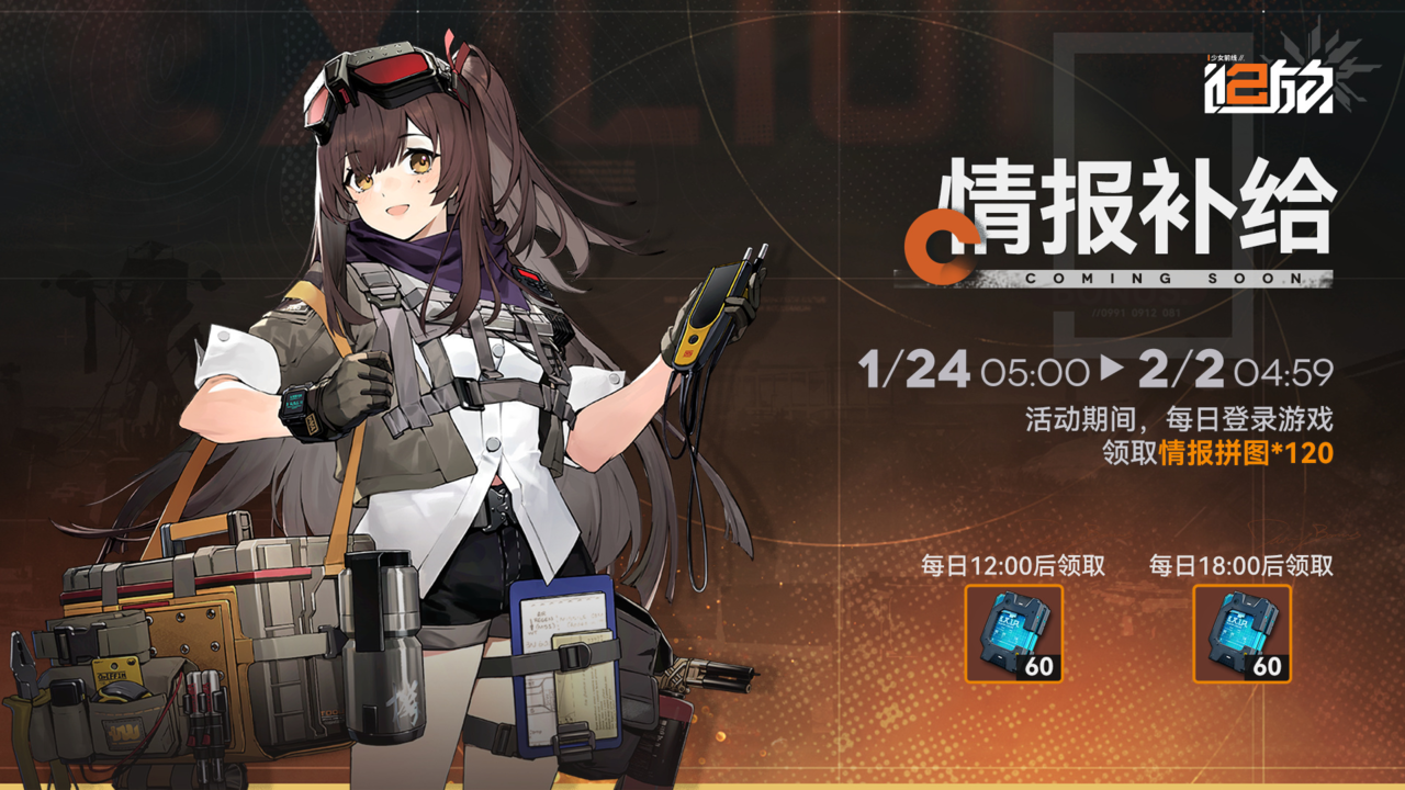 尊敬的指挥官,【情报补给】活动即将于1月24日05:00~2月2日04:59开启。活动期间,每日于指定时间登录游戏,即可领取「情报拼图x120」奖励!