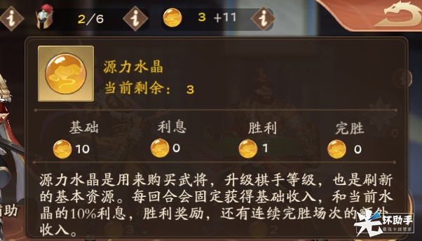 ③源力水晶用于刷新/购买武将与队伍升级。每场胜利后,固定获得水晶收入与当前10%的利息,利息最大上限为10
