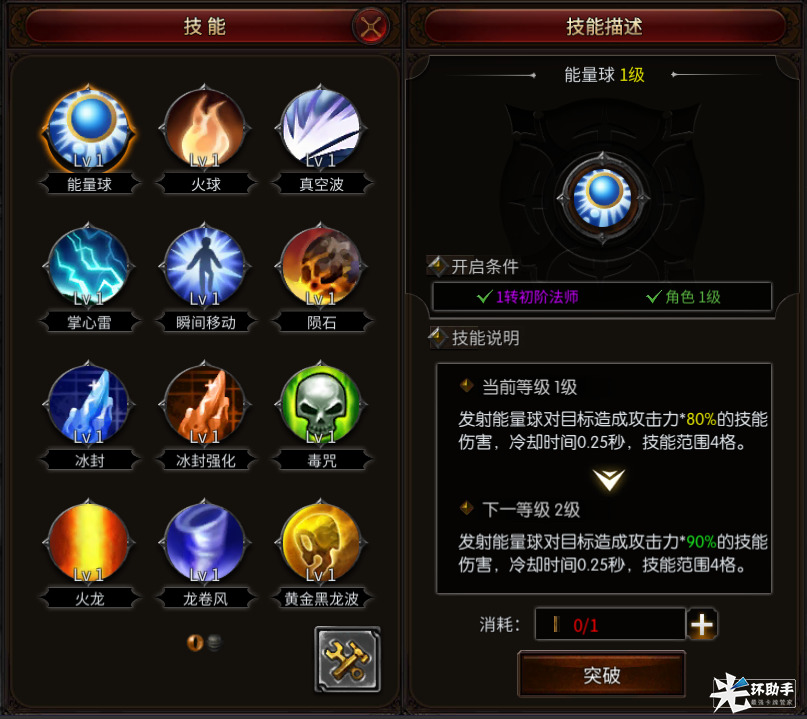 魔法师初期学到的技能非常多,如能量球、火球、真空波、掌心雷、陨石、火龙、龙卷风、黑龙波,都是在刚进入游戏时学习的技能。技能虽多,但是日常使用以陨石和黑龙波为主。陨石为单体攻击;黑龙波为群体攻击,用于群刷小怪升级。