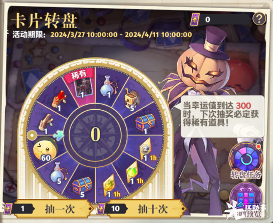 使用幸运卡牌进行转盘抽奖,每次进行抽奖即可获得幸运值,幸运值达到300时必出稀有道具,获取稀有道具后,幸运值清零;