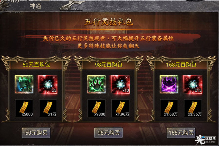 购买五行灵技礼包(灵技·噬魂、灵技·夺魂、灵技·天尽)可提升所有五行装备元素属性!