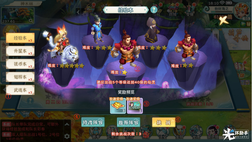 在日常副本中可以获取养成用的升级道具、升星道具、翅膀升级道具、龙魂升级道具、技能道具、武魂道具,并且战斗胜利后能够获得大量经验。如图中①为副本名称,②为副本剩余挑战次数。