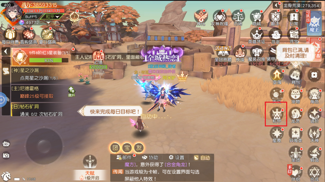 机甲:本游戏极具特色的系统之一,玩家在游戏内可以获得不同的机甲,通过升级、进阶、升星、开启技能等大幅度的提升战力,增加的属性由主角全部继承。机甲相关道具可通过攻略魔王探险、魔王梦境和商城等途径获得。