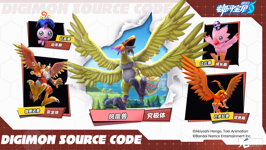 在广阔的源码营地,分布着无数身怀绝技的“数码宝贝”,通过神殿进化链了解它们从幼年期至究极体的进化路线,无疑能让战斗事半功倍。让我们欢迎本期主角!比丘兽究极进化~~~凤凰兽!