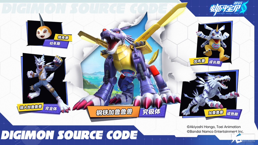 在广阔的源码营地,分布着无数身怀绝技的“数码宝贝”,通过神殿进化链了解它们从幼年期至究极体的进化路线,无疑能让战斗事半功倍。让我们欢迎本期主角!加布兽究极进化~~~钢铁加鲁鲁兽!