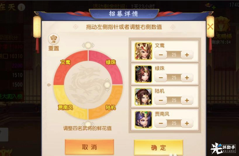2、 在招募前,主公需要先选择自己心仪的四名晋将进行招募,主公可以消耗元宝使用漫天花雨提高招募武将权重(主公可以随时更改招募武将);