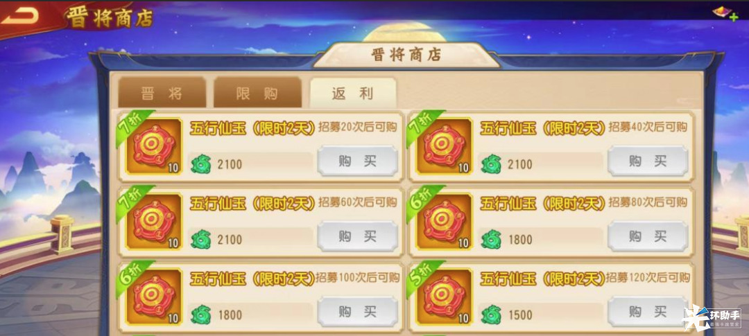 5、招募会产出晋将整将、晋将碎片、五行灵尘、金色万能神兵,元宝等资源。在活动中招募满一定次数后,主公可以在晋将商店的返利页签中,以折扣价购买五行仙玉,返利商店购买的五星仙玉只可用于本次晋将活动;