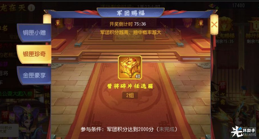 2、在天龙赐福的1小时50分钟内,只要主公招募到晋将整将,则该主公可以额外获得2个晋将任选箱,中奖主公所在军团其他成员,均会获得1个晋将任选箱;