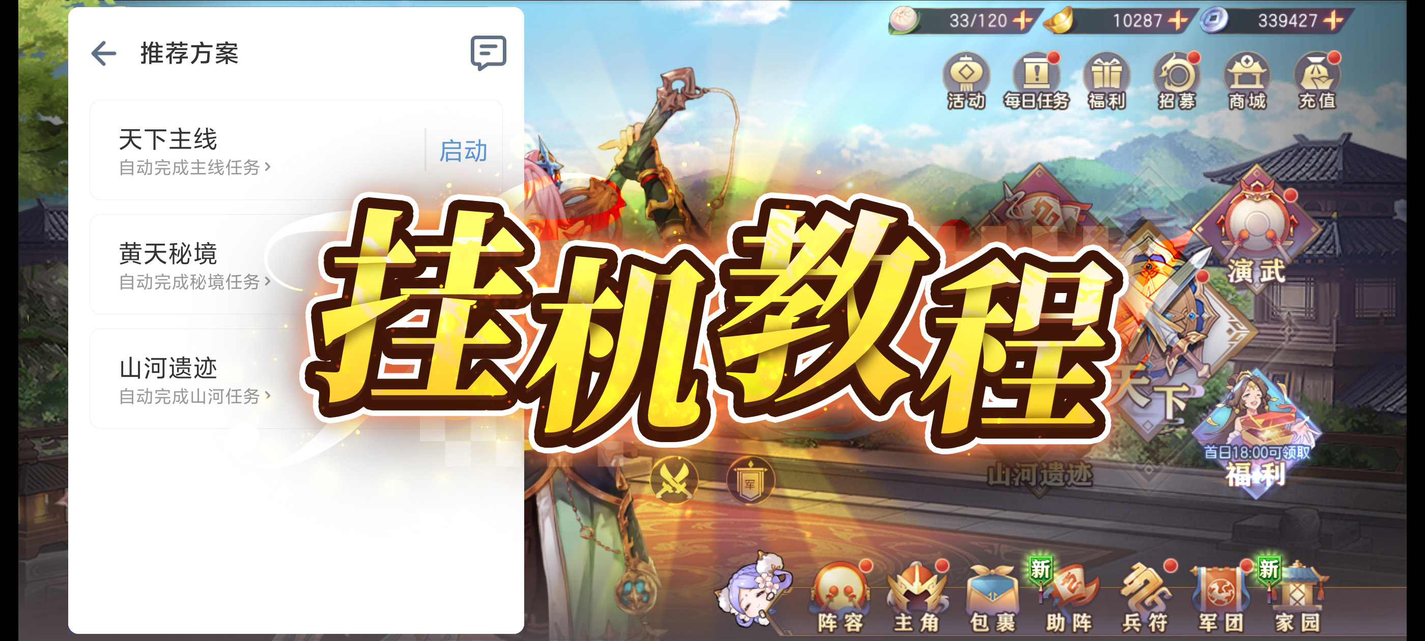 已经制作挂机的玩法有:天下主线、黄天秘境、山河遗迹
