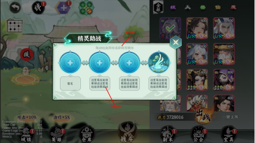 1、恶魔之塔通关第600层开启精灵功能,解锁宝具精灵分页,战斗准备厅精灵功能UI和战斗中的UI