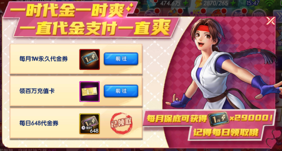 【活动内容】:玩家创角次日起可在游戏内每天领取【648元】的游戏代金券