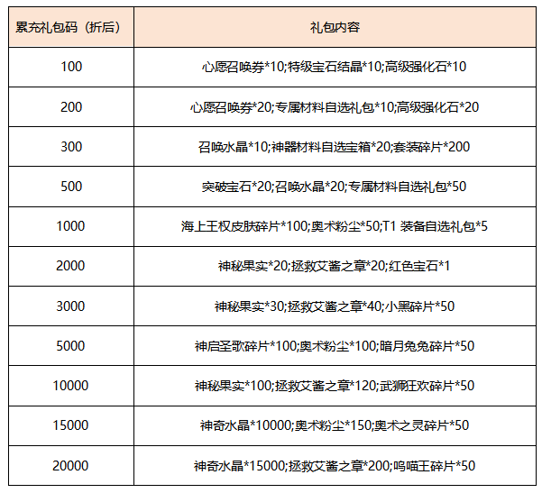【活动内容】:活动时间内,玩家累计充值达到指定金额(折扣后),即可在领取对应礼包