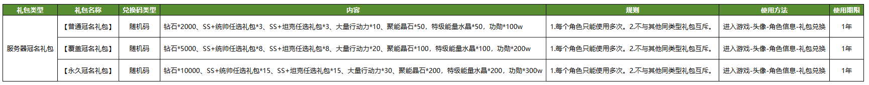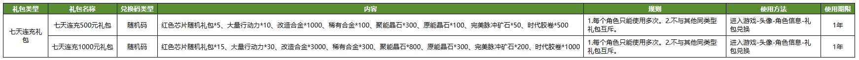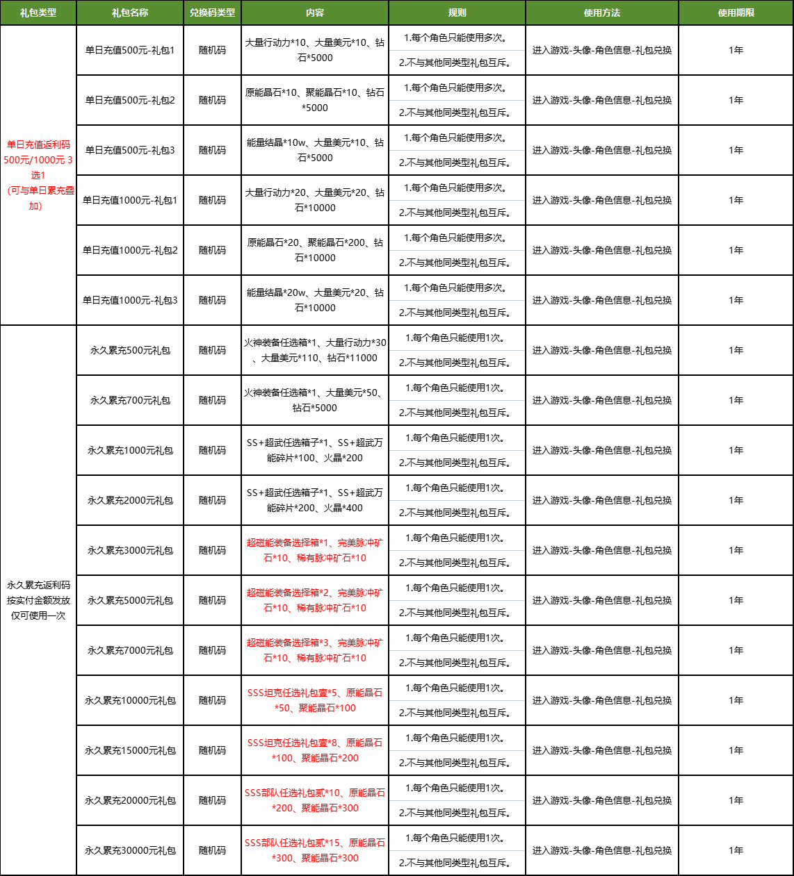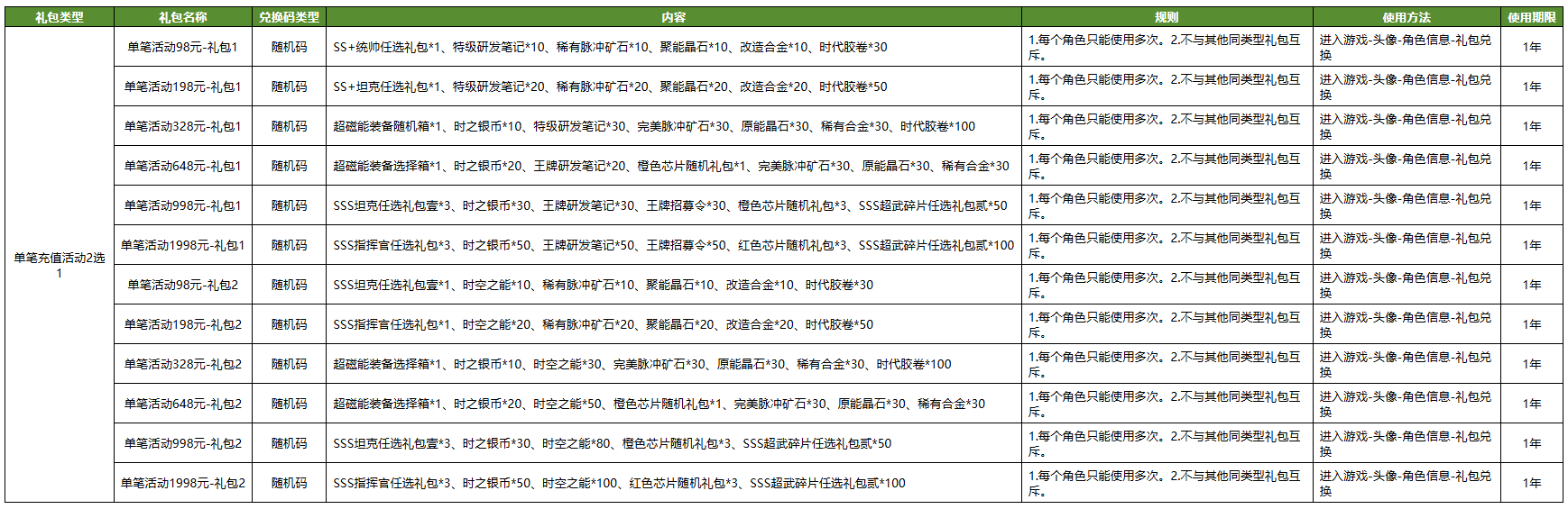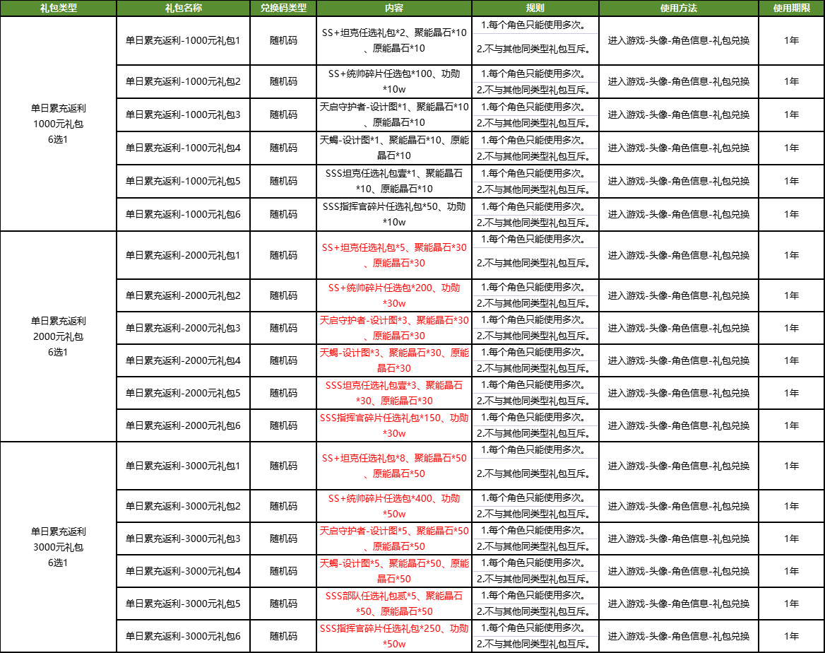 1、(可与单日充值奖励活动叠加)按达标最高档位参与1000元/2000元/3000元中6选1,可多次使用同批次礼包码——坦克(天蝎/天启守护者) 仅在此活动产出