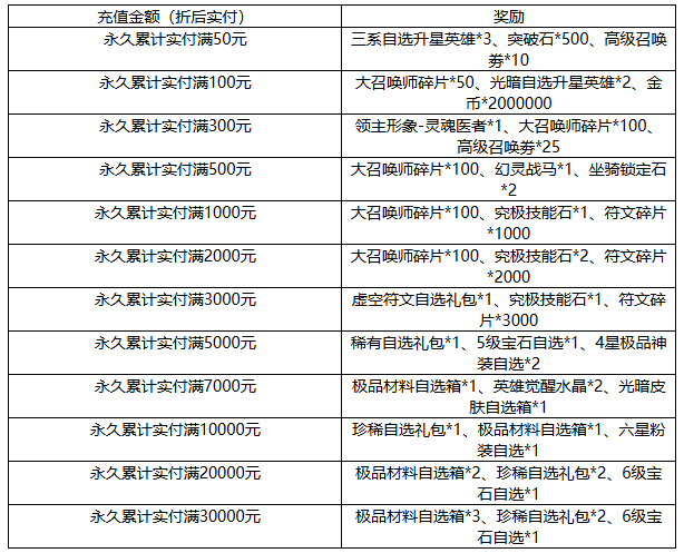 1、活动期间玩家历史累计充值金额达成指定额度即可领取奖励,每个档位仅可领取一次