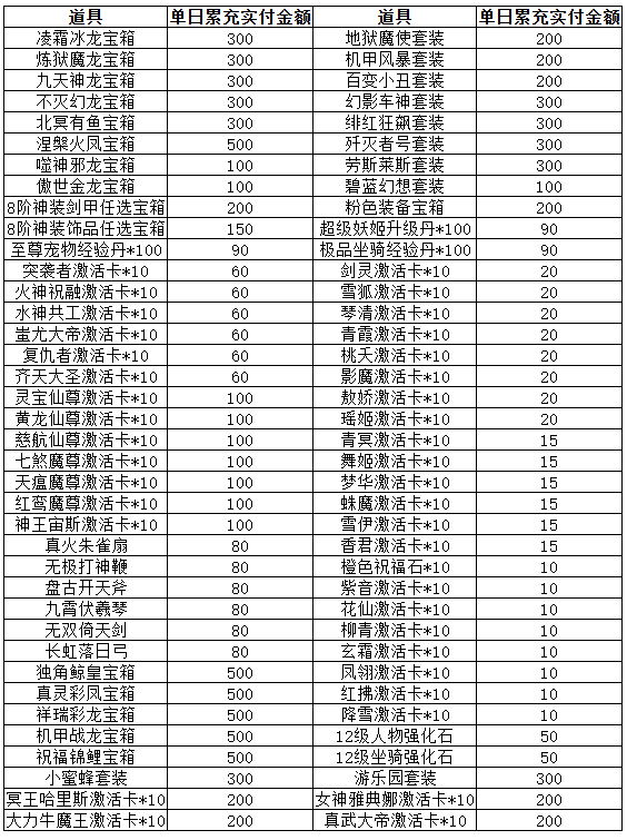 2、单日达到充值条件(额度足够情况下可自由搭配等值道具内容和数量)的玩家,选好道具后可向平台客服申请发放;