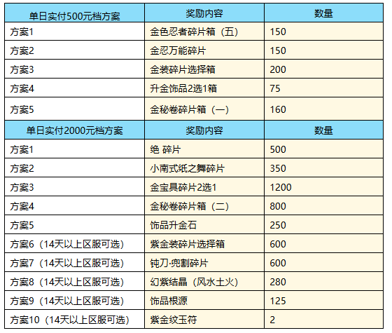 根据单日实付累充金额选择返利方案,可自由组合。如单日充值3000元,可选择2000元档方案1次+500元档方案2次