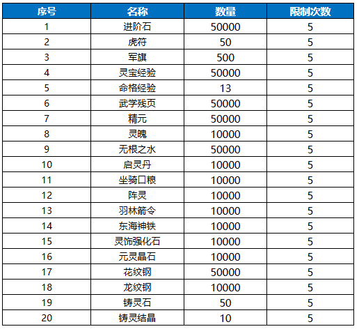 终身累充折后2000元:精选神魔武将*5、突飞猛进丹*15、天级天书*3、6星通用卡*8、武学甄选箱*10