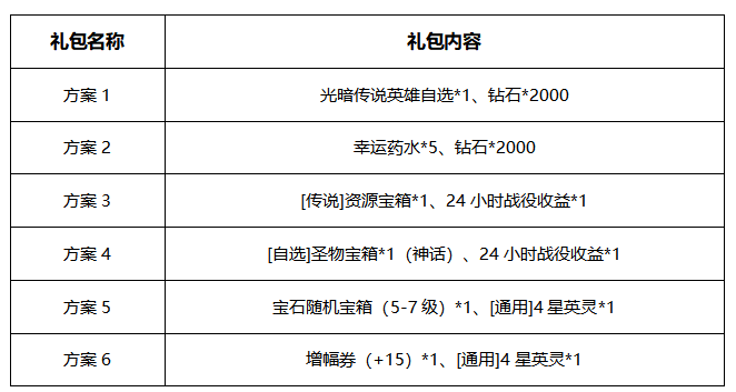 3.玩家可通过单日充值自由选择方案,例如:玩家单日充值1000元,则可选择方案如下:方案一+方案二或2个方案一等方案