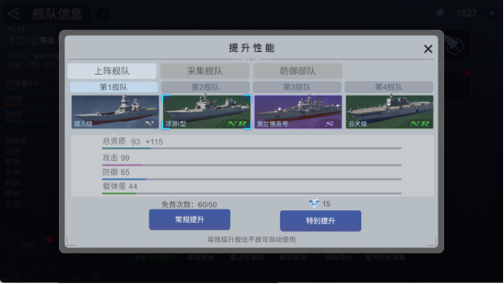 通过“提升性能”界面消耗次数强化战舰资质,常规提升的次数可通过完成战役或是等待时间恢复来获取,或使用“特别提升”快速突破。