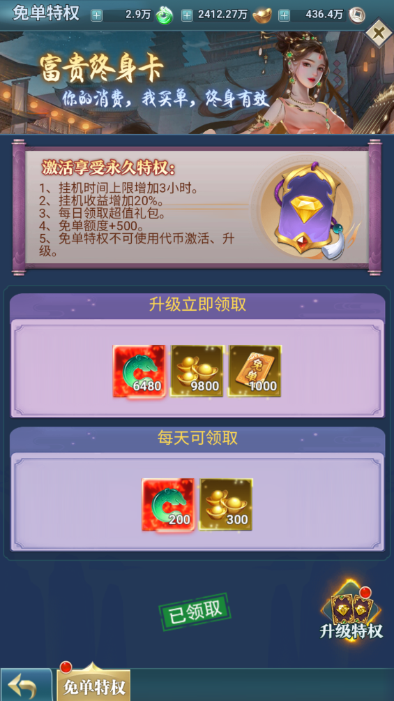最后不要忘了免单特权功能,开启免单特权后,每日有固定免单额度,可以购买游戏内充值礼包的,一定要记得把每日额度用完,第二天会重置免单额度。