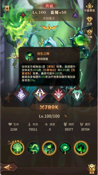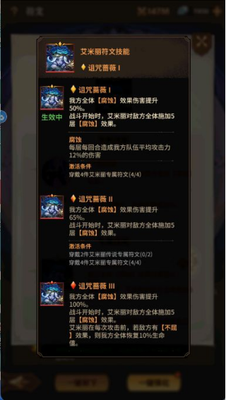 1、前期有啥用啥,尽量最求高星。建议前期所有的自选都选择腐蚀的,在前中后期腐蚀的作用都很大,尤其是对零氪玩家。前期零氪玩家最优先的追求是艾米丽的升到12星,然后幻境商店橙色币存够400,买一套艾米丽的专属符文,然后洗成全部都是输出符文。效果为腐蚀效果提升50%,开局全体加五层腐蚀,腐蚀的羁绊开局也能给五层腐蚀,就是开局对面10层腐蚀,配合盖亚就是开局50层buff。请看下图