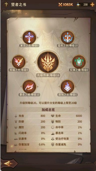 4)公会,如果你足够活跃,在世界频道寻找合适的公会,必须钻石捐献,获得灰蕈灵液用于贤者之书升级,中间的先驱传承升级到指定等级,开启其他六个属性升级。国际服的攻略建议是六个属性等级先均等升到130级再针对自己想要的属性再升级。升级过程会获得技能点,优先点最左边的攻击,其次是中间的防御。