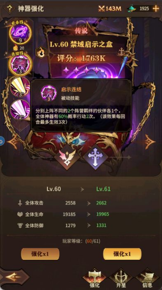 6星3个阵营羁绊即可有几率神器行动2次,9星20能量就可以启动