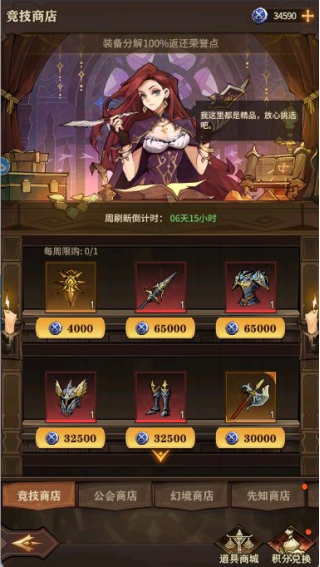 6)装备,装备兑换币主要来源竞技场和装备分解,前期竞技场任务能获得很多装备,有余力可以多打竞技场刷任务。装备可以把背包多余的装备分解,在商店购买好的来提升战力,分解是无损的,所以建议是先全套橙色,再全套橙色+,再弄全套红色。如下图