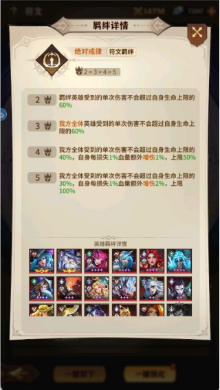 符文作用:1.大幅提高战力,2.装备4个开启克制技能,比如德拉姬娅的枷锁,白素贞的不屈,3.英雄8星且全套橙色开启符文羁绊,个人推荐绝对戒律符文羁绊,如下图