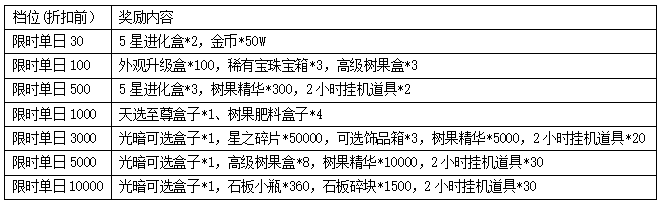 永久累充20000元礼包:光暗可选盒子*2,可选饰品箱*30,高级树果盒*40,树果肥料盒子*25,2小时挂机道具*70