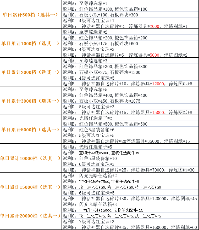 1、可以选择对应奖励的方案(活动按照游戏内折扣前计算,按照游戏内礼包显示金额为准) 单日累充活动只按最高档申请且选其一(A.B.C.D.E中选一)