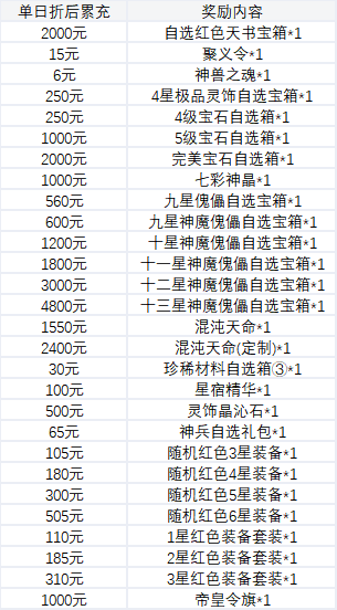 单日累计充值20000元(折后100元):高级招募令*30、神兽结晶*80、铜币*100万