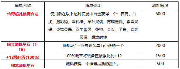 冠名礼包(折后实付1000元可领):12强化券(100%)*1、经典超凡使魔宝箱*1、暗金随机星石(1-15)*1