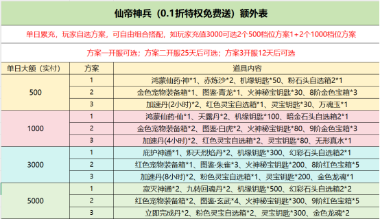 永久累计充值200000(实付2000)元:红色灵宝自选箱*1、6级黄仙玉*2、6级紫仙玉*2、红色宠物装备箱*3