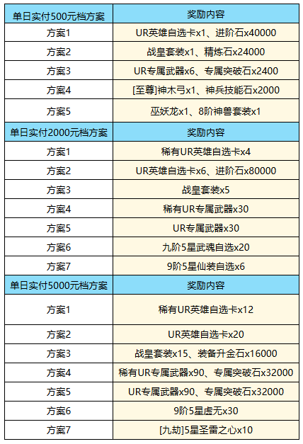 根据单日实付累充金额选择返利方案,可自由组合。如单日充值3000元,可选择2000元档方案1次+500元档方案2次